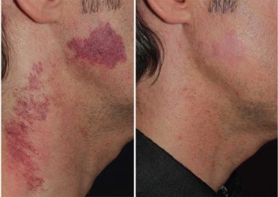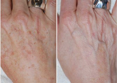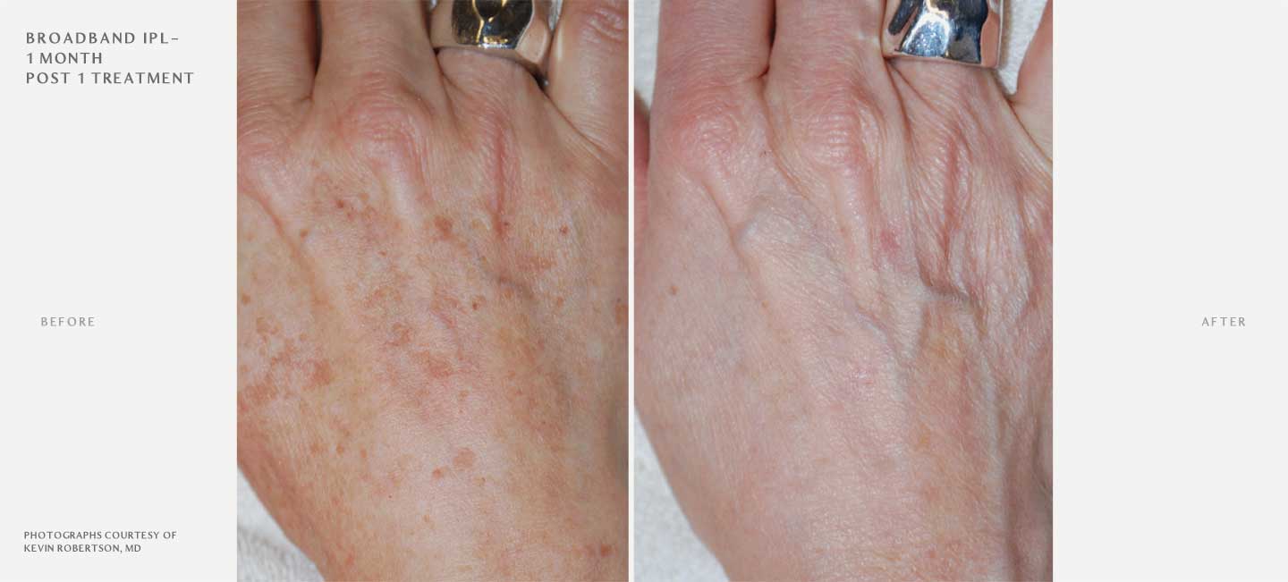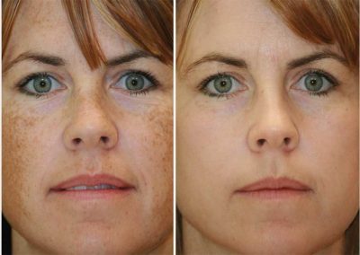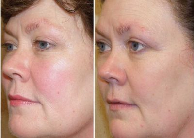 A BBL treatment is non-invasive and non-ablative. There is typically only mild redness and heat that can persist for several hours post treatment but no bruising or swelling. This means this patient can return to their normal routine right after the procedure without having to worry about downtime. Avoiding active ingredients like glycolic, salicylic or lactic acid and retinol before and after treatment for 72 hours is critical to keep the skin safe. Minimizing sun exposure before and after treatment is also important along with sunscreen of SPF 30 or higher.