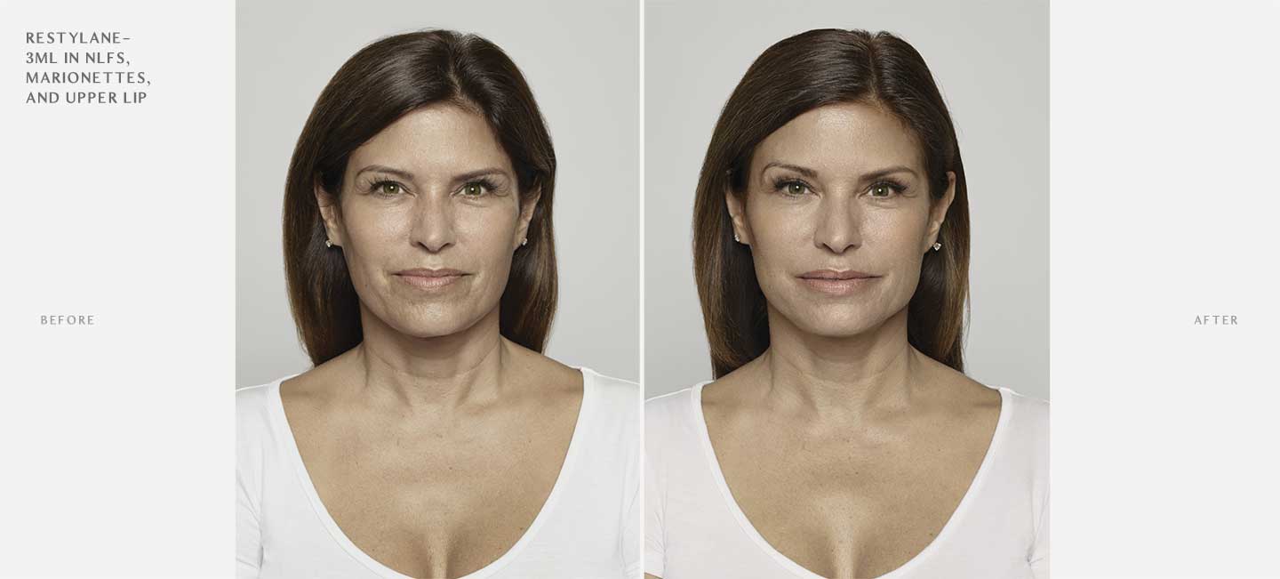 Restylane is a highly versatile injectable dermal filler that can immediately restore lost volume from aging and smooth out moderate to severe lines and wrinkles. Composed of a highly biocompatible hyaluronic acid base, Restylane acts very much like the body’s naturally occurring hyaluronic acid, instantly hydrating the affected areas to visibly smooth out folds and add definition and fullness to aging areas of the face.